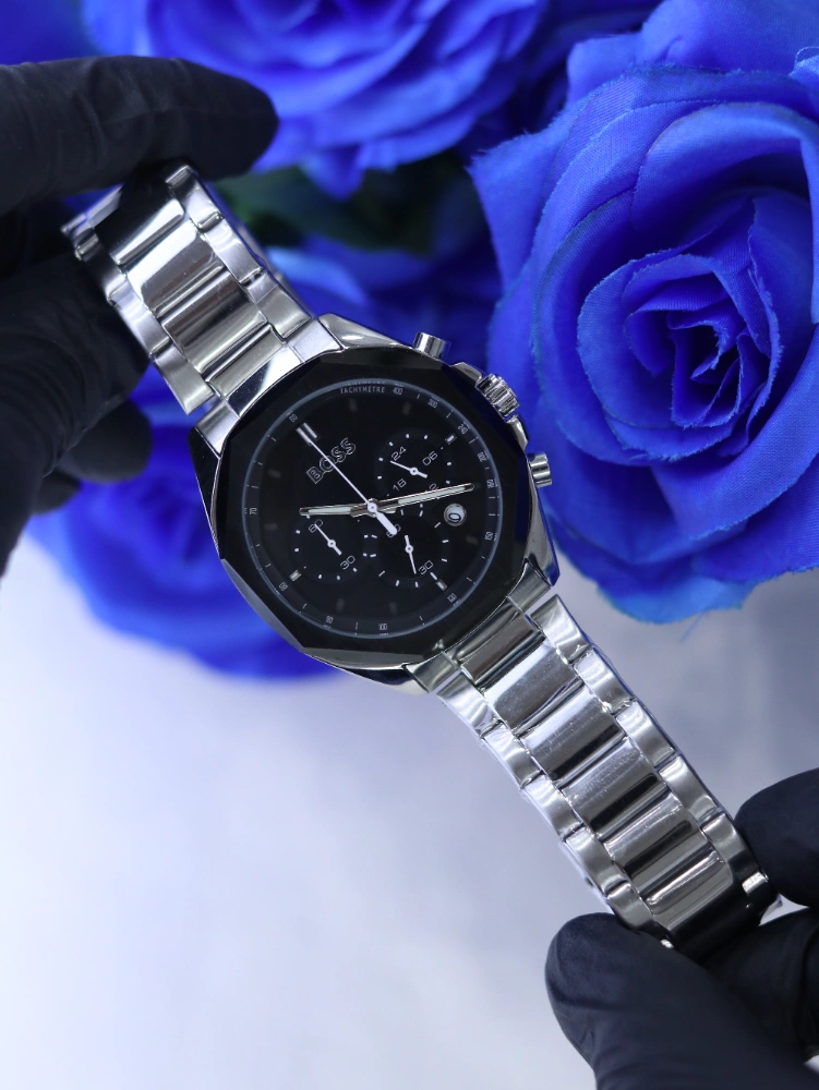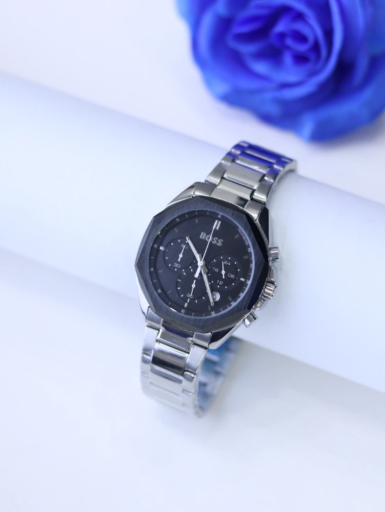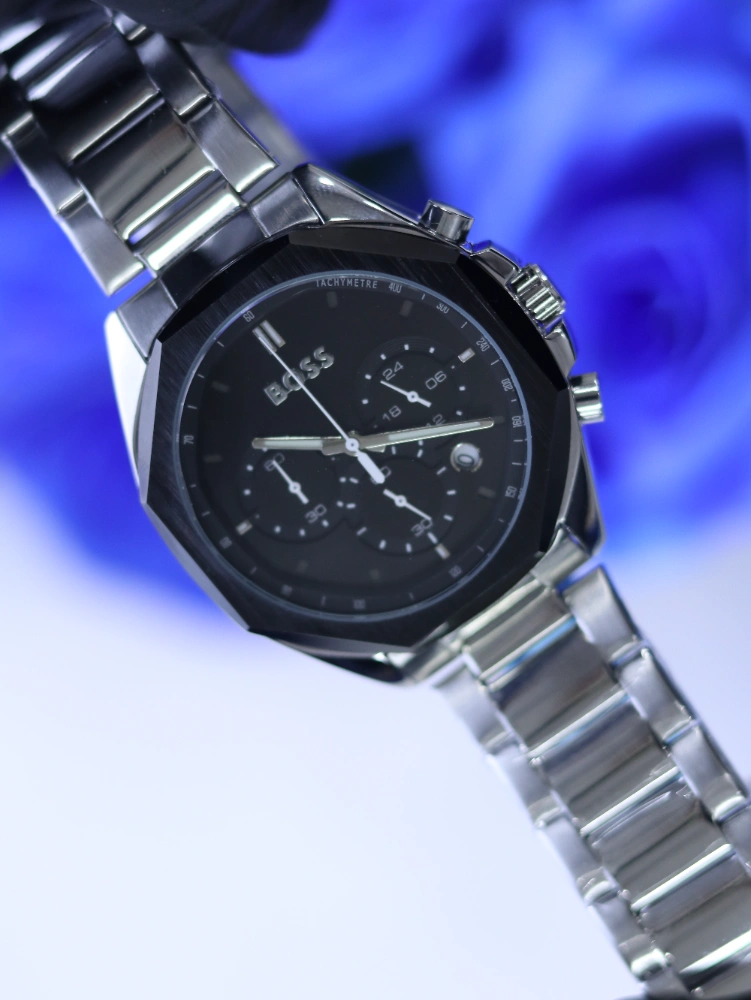 ارتق بإطلالتك مع ساعة BOSS الرجالية كرونوغراف – فضية بمينا سوداء متعددة الأوجه، التي تمثل التوازن المثالي بين الفخامة والأداء العالي.